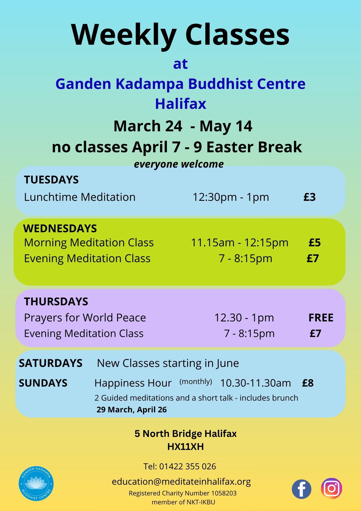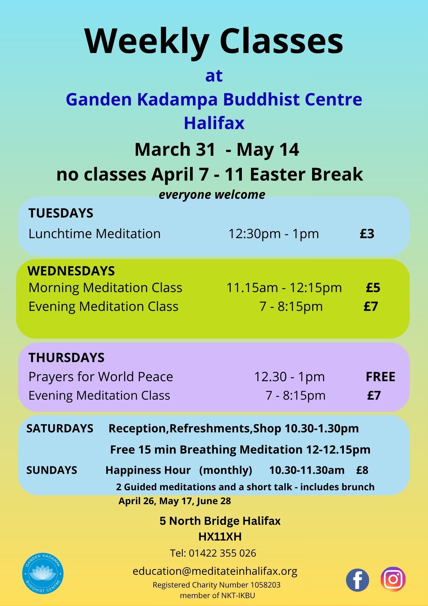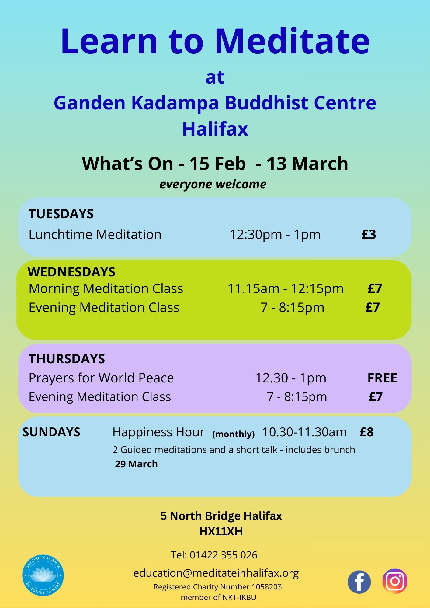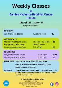 Located centrally at North Bridge, we offer a variety of meditation classes to suit everyone, whether you are just wanting to have a ‘quick go’ at meditation one lunchtime, or want a more in-depth session one evening. We also have meditation classes in Hebden Bridge and Mytholmroyd. Please check out our photo boxes below and menu on every page. Do drop in for refreshments every Wednesday between 12.30 – 2.30pm – we serve tea, coffee, soft drinks, cake and chat! You can also browse our book and gift shop – we look forward to meeting you! (Click any of the pictures, boxes, banners, photo boxes below to go to page information),